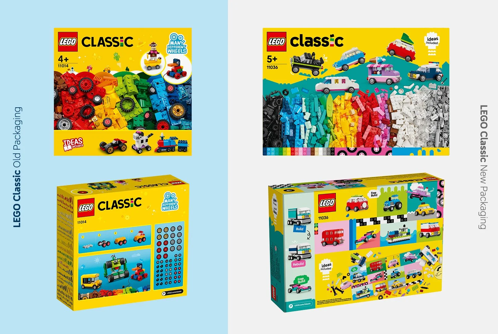 Comparison of the old LEGO Classic box and the 2024 redesigned box.